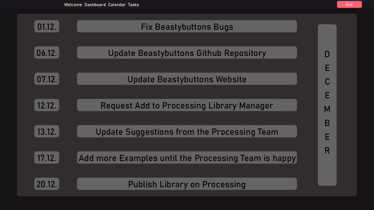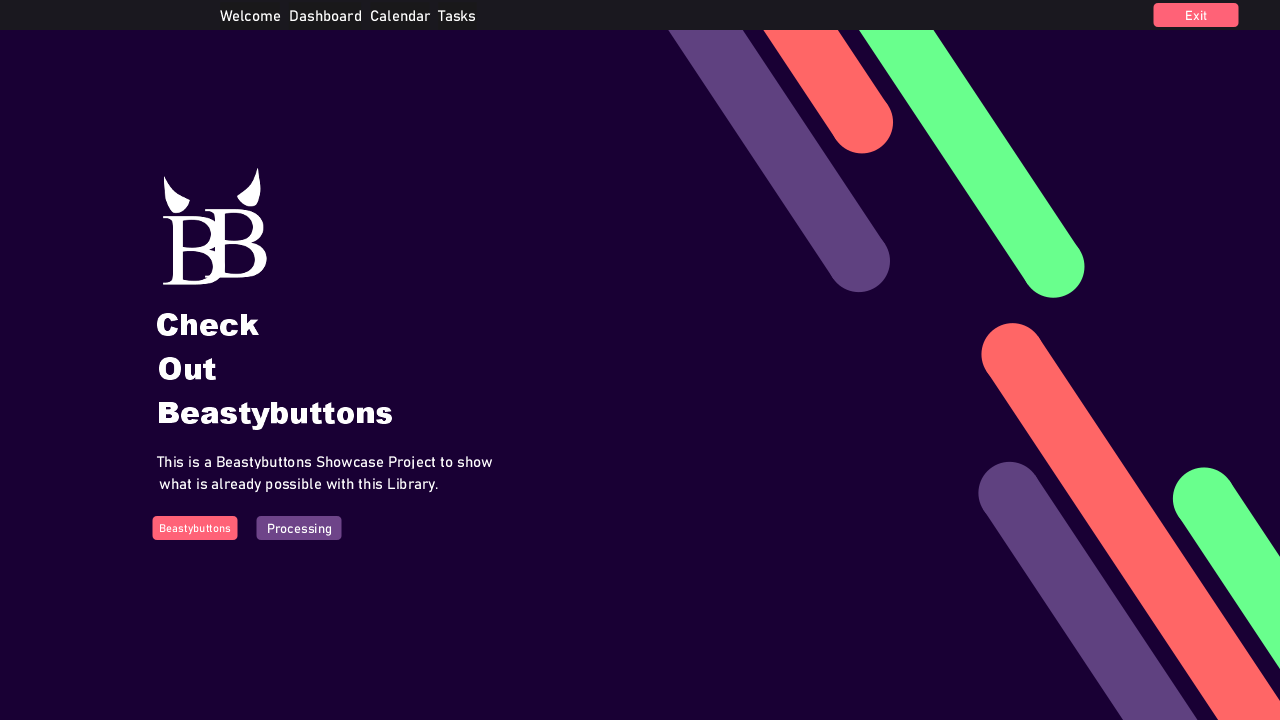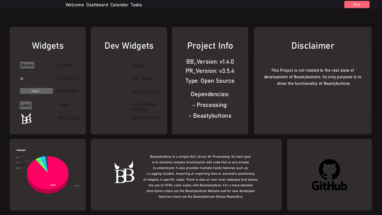 BeastyButtons is a lightweight GUI Lybrary for Processing, including multiple GUI Widgets, Handlers, Layers an automatic Logging System, an automatic Align System, importing and exporting Layouts as well as Layout Presets. There are also multiple Surfaces of Widgets supported, as well as animating between them for a transition. Almost all Parameters can be modified at runtime making it a very variable and flexible system. You can get References to a Widget by either its ID or its SOURCEPATH - also at Runtime. Furthermore you can set Widgets active/inactive and visible/invisible. Other supported Features are a Tooltip System and also changing shape, text, font and color of widgets. At Creation of Widgets many Parameters are automatically calculated to make the usage a whole lot easier. If you don’t want that behaviour you can of course overwrite several Parameters afterwords.